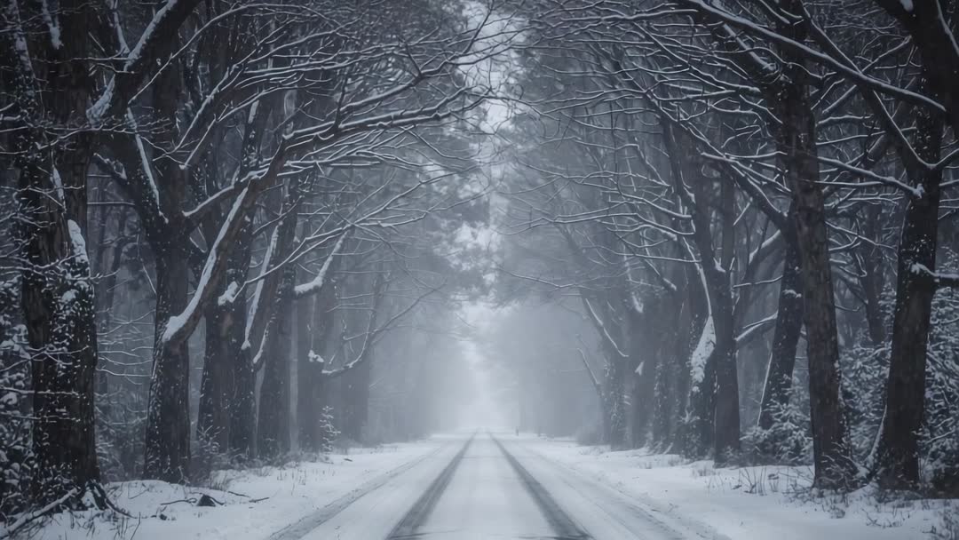 AI Generated Video. Footage showing fixed wide-angle view down misty snow road lined by bare trees forming tunnel-like canopy. Scene featuring twin tire tracks guiding eye toward distant vanishing point through soft falling snow and rising fog. Lighting muted with cool blue-gray tones, mood cinematic, tranquil, mysterious. Ideal for use as background for winter commercials, travel sequences, documentary establishing shots, seasonal social media posts, website hero banners, and cinematic title intros. Suggestions: pairing with ambient cold wind sound, adding slow push-in or dolly zoom, overlaying text or logo on upper fog area, color grading for dramatic contrast, looping for ambient backgrounds. Licensing notes: suitable for editorial and commercial use in projects needing solitude, winter landscape, or moody atmosphere.