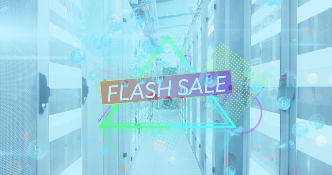- Flash Sale Animation with Bitcoin Symbols in Server Room