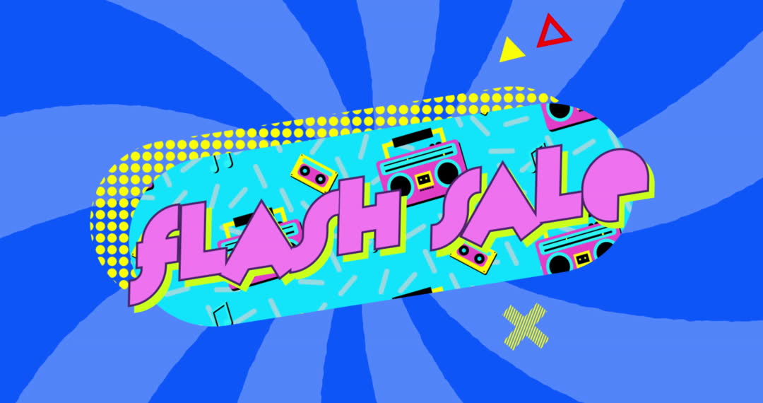 Fun and vibrant poster with a retro music theme illuminating flash sale message energized by dynamic shapes and colors. Suitable for online promotions, event advertisements, social media content, and enhancing excitement about timelimited deals and offers.