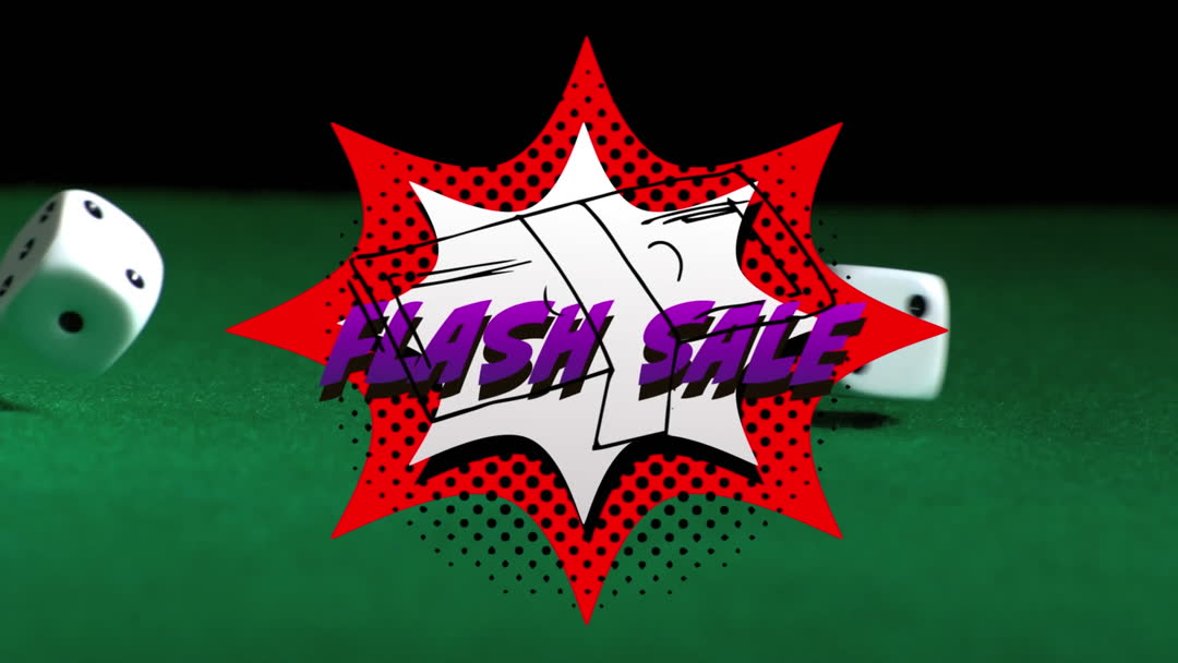 Dynamic video clip showcasing vibrant text 'Flash Sale' accompanied by two dice on a classic green felt background. The energetic style suggests excitement and immediacy, ideal for promotional campaigns or advertisements on social media. This engaging graphic can be used to grab attention for special discounts or offers in retail businesses.