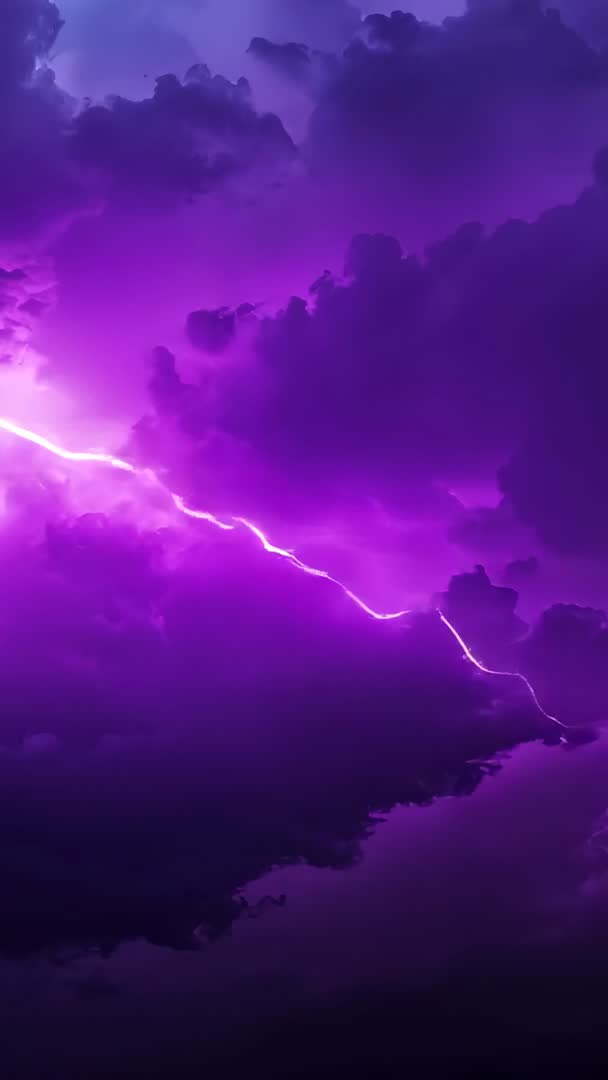 AI Generated Image. Video showing intense purple storm clouds flashing with jagged lightning arcs cutting through violet sky. Dark nimbus formations moving and glowing, electric strikes revealing textured cloud cores. High-contrast palette emphasizing neon purple and deep indigo, cinematic vertical framing optimized for mobile and social platforms. Useful for creating dramatic openers, sci-fi intros, music video backdrops, weather segments, app splash screens, social media stories, phone wallpapers. Including overlaying bold typography, applying slow-motion effects, syncing with electronic music, color grading for cinematic mood. Suitable for designers, filmmakers, advertisers, content creators wanting dynamic atmospheric visuals conveying power, energy, suspense.