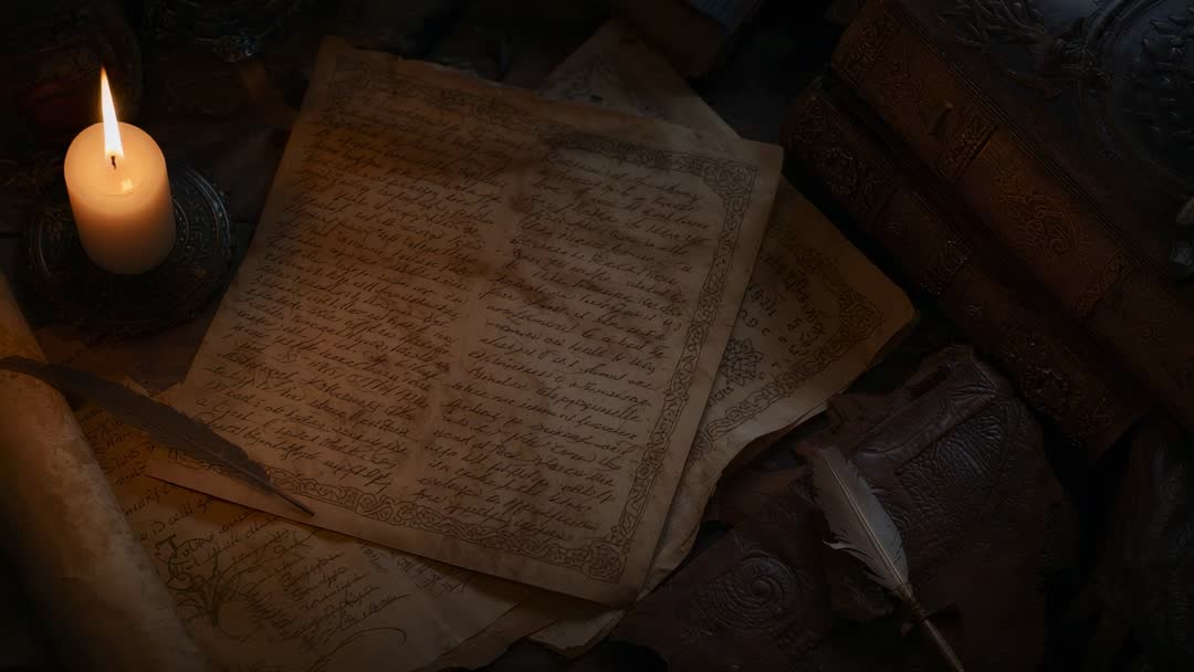 - Flickering candlelight revealing aged manuscript, quill, scroll, and leather-bound books