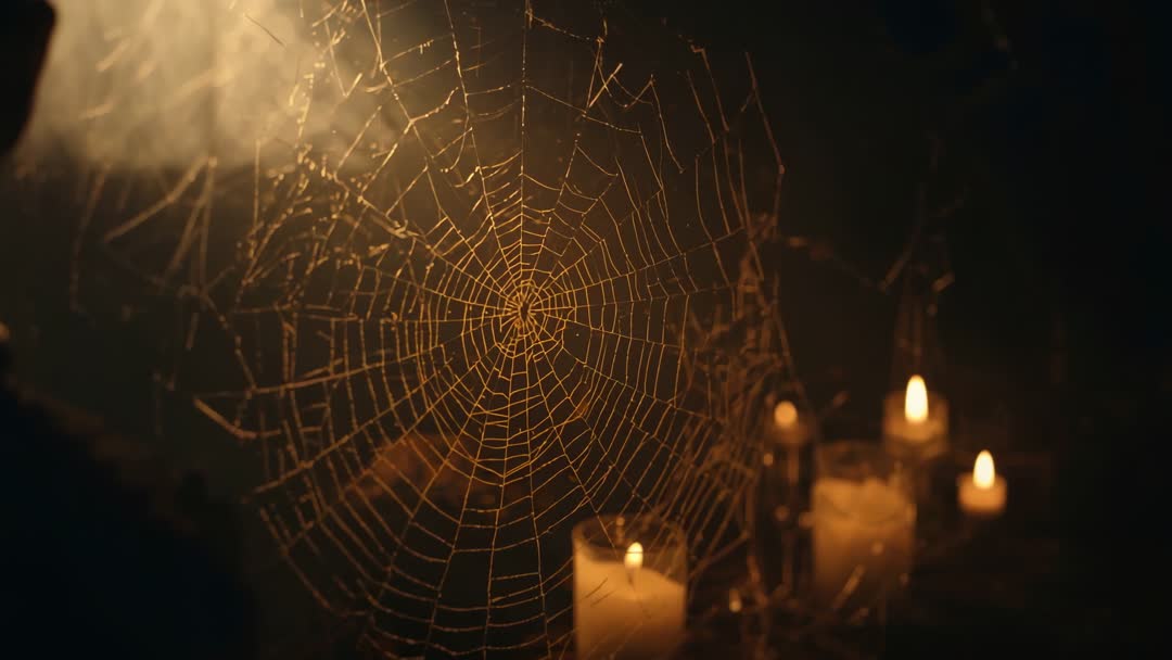 - Flickering Candles Illuminate Eerie Indoor Spiderweb in Dim Lighting