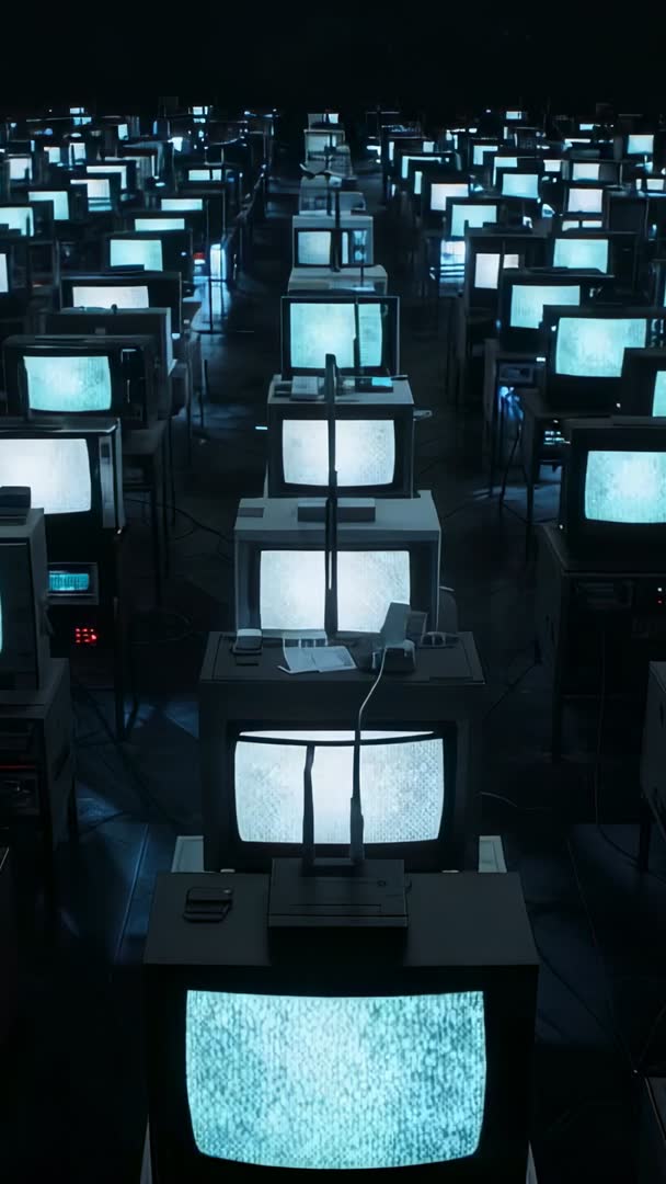 AI Generated Image. Showing rows of vintage CRT televisions arranged in long grid, each screen flickering with shifting blue-white static. Creating moody cinematic atmosphere with deep shadows, reflective floors, and tangled cables snaking between sets. Featuring mix of tight screen details and wide aerial perspective, conveying themes of signal loss, media overload, and technological decay. Serving as vertical video optimized for mobile platforms and social reels, fueling film title sequences, music video backgrounds, VJ loops, gallery installations, and promotional spots for retro electronics or art exhibitions. Offering cold blue color palette and subtle motion ideal for adding custom sound design, overlays, and text treatment.