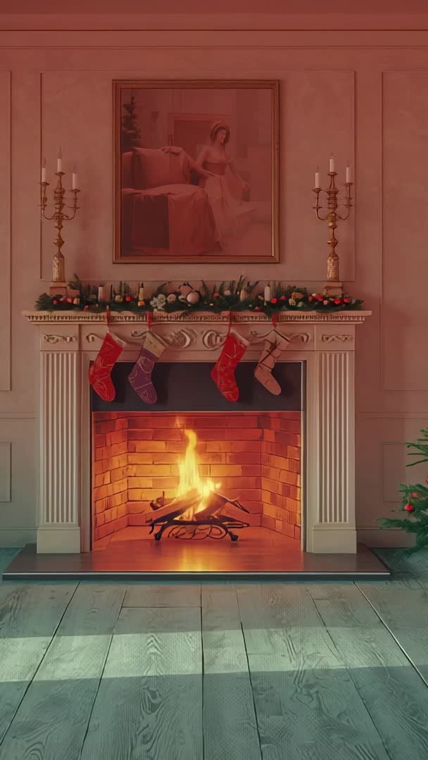 AI Generated Image. Vertical video showing flickering flames and warm mantel glow, with holiday stockings hanging from garland and candelabras flanking scene. Camera holding steady near hearth, capturing wood crackling and soft ambient light while flames dancing. Scene creating cozy, nostalgic mood ideal for holiday marketing, social media reels, seasonal website banners, greeting card animations, background for product shots, fireplace safety tips, interior design features. Useful for retailers promoting home decor, hospitality brands highlighting winter comfort, streaming services opening credits, real estate listings emphasizing charming features. Color grading advice: warm tones amplifying comfort; audio suggestion: gentle crackling fire or soft piano music. Recommended durations: 10–30 seconds for social media, 30–60 seconds for website hero loops. Clip delivering timeless holiday atmosphere and versatile seasonal use.