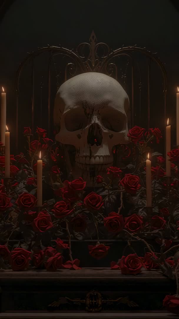 AI Generated Image. Video presenting flickering candle flames casting deep shadows across human skull nestling among red roses on antique altar. Lighting creating dramatic chiaroscuro contrast and moody atmosphere with warm candle glow and cool ambient shadow. Composition focusing on central skull framed by ornate metalwork and thorny rose stems, offering strong vertical orientation for mobile and social platforms. Suited for Halloween trailers, gothic romance book covers, horror film titles, music video intros, occult or ritual documentary sequences, funeral or memorial design, and brand campaigns seeking dark romantic or antique aesthetic. Editing suggestions: applying slow upward pan or subtle zoom, creating loopable 6-12 second cut, adding slight film grain, desaturating shadows, boosting reds, and adding soft vignette for cinematic mood. Leave negative space along top or bottom for title text or logo placement; use light-colored serif font for contrast. Ideal for vertical ad spots, Instagram Reels, TikTok content, streaming thumbnails, and cinematic social storytelling.