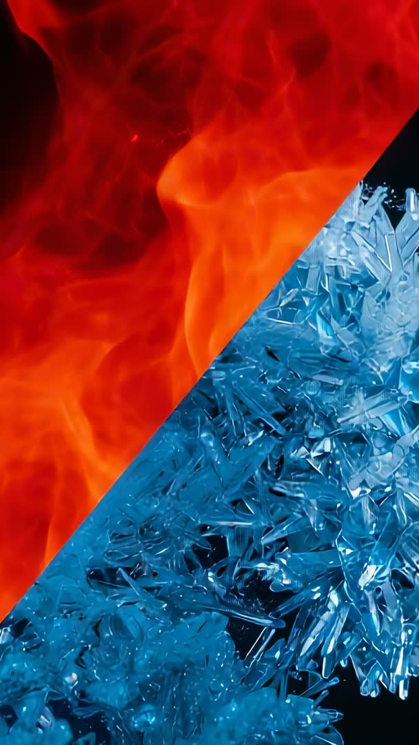 AI Generated Video. Vertical footage showing diagonal split between flickering orange-red flames and faceted blue ice crystals. High-contrast composition emphasizing duality between heat and cold while close-up textures are creating dramatic abstract visuals. Ideal for social media reels, vertical ads, smartphone wallpapers, music visualizers, product promos, or editorial pieces on contrast, energy, or climate. Looping-friendly clip with clear diagonal safe area for text and logo placement; recommend export at 9:16 1080x1920 and subtle color grade to boost red and blue separation. Use as background for title cards, transition element in montage, or visual metaphor for conflict and balance.