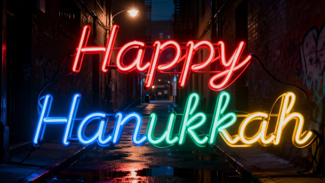 AI Generated Image. Featuring flickering neon Happy Hanukkah lettering glowing above wet urban alley, puddles mirroring vibrant red, blue, green, and yellow tones. Cinematic 16:9 frame capturing moody nighttime atmosphere, brick walls, graffiti accents, and solitary street lamp adding depth. Useful for holiday marketing, social media greeting videos, event promos, seasonal website headers, and retail display loops needing modern urban Hanukkah visuals. Easy to loop for background animation; recommend adding subtle electrical hum and distant rain audio for immersive mood. Color grading options include boosting saturation for festive feel or desaturating for gritty, film-noir vibe. Suitable for digital banners, TV spots, countdown overlays, and editorial or commercial projects celebrating festival of lights.