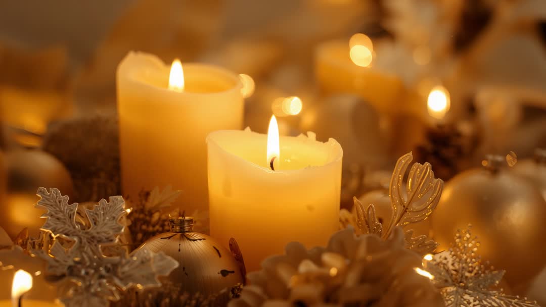 AI Generated Video. Showing flickering pillar candles warming golden holiday centerpiece while camera shifting focus, revealing melting wax drips and glowing ornaments. Using shallow depth of field and soft bokeh, creating cozy, intimate mood and rich gold palette. Working well for holiday marketing, social media backgrounds, greeting card animations, restaurant or hotel holiday promotions, relaxation and meditation loops. Serving as looping background, title opener, product overlay, website hero banner, or seasonal greeting animation, helping brands convey warm, elegant atmosphere.