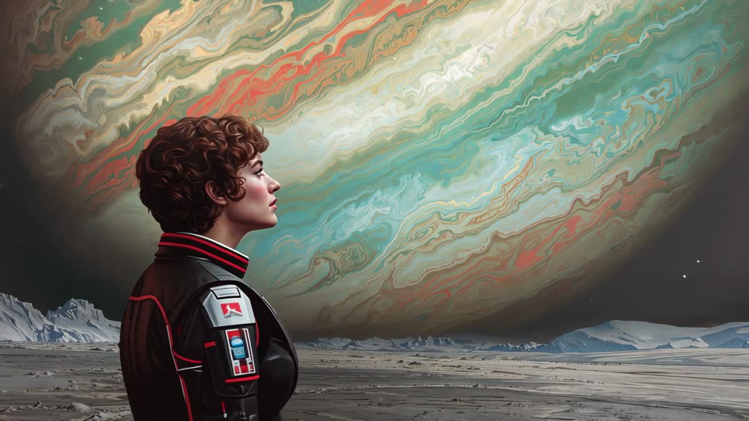 AI Generated Video. Frame presenting profile of flight-suited astronaut gazing at massive swirling gas giant looming above frozen plain. Camera tightening with slow push-in, accentuating contemplative mood and dramatic scale. Color palette featuring teal, coral, muted gold streaks, creating surreal cosmic backdrop. Composition combining close-up portrait with expansive wide-angle landscape for strong sense of scale and solitude. Recommended uses: sci-fi trailer clip, cinematic teaser, book trailer, game cinematic, hero background for landing page, concept pitch, educational clip for planetary science, social media reel, poster motion loop. Licensing possibilities: editorial, promotional, cinematic, advertising. Production notes: maintaining slow ramp on zoom, adding subtle ambient pad and distant wind for atmosphere, color grading to enhance teal and coral contrasts, adding particle dust for depth. Aspect ratio suited for 16:9 video, safe copy area available for lower-thirds and titles.