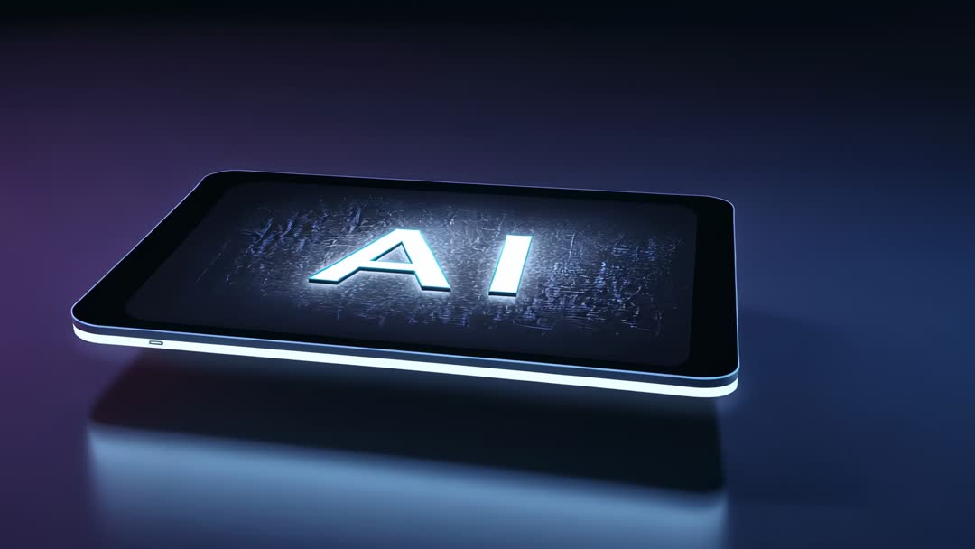 AI Generated Image. Video showing slim tablet hovering above glossy reflective surface while AI glyph glowing on screen and LED rim emitting cool blue light. Scene featuring subtle gradient background, deep shadows, and crisp reflections for cinematic high-tech feel. Suiting tech presentations, product demos, branding, UI concept reels, startup pitch decks, website hero banners, social media promos. Allowing easy overlaying of text and logo, color grading, and slow zoom for dramatic reveal. Providing high-contrast blue tones for futuristic branding and clean compositing with dark backdrop.