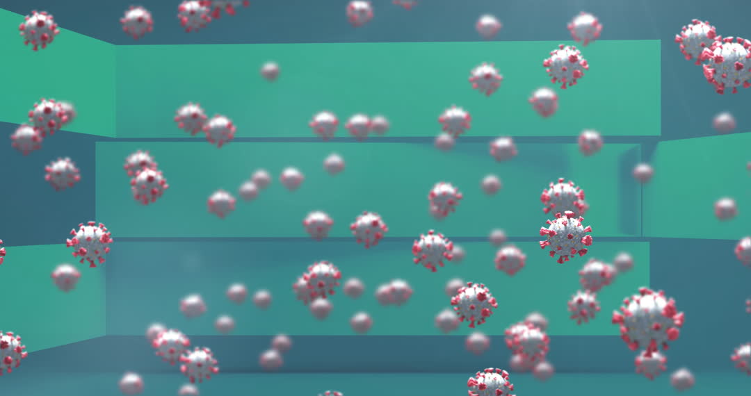 Animated representation of COVID-19 cells floating in abstract space, highlighting the virus's omnipresence. Bold design with a blue and green background suitable for educational or informational materials. Excellent for illustrating pandemic-related articles or presentations on healthcare.
