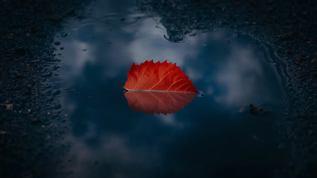 AI Generated Image. Video frame showing single crimson leaf floating on rainwater pooled in asphalt depression, reflecting cloudy sky and creating delicate ripples. Deep blue tones surrounding vivid red leaf creating strong color contrast and moody atmosphere. Shallow depth of field keeping focus on leaf and mirror reflection while surrounding pavement softly blurring. Motion suggestion including gentle bobbing and concentric ripples radiating outward from leaf contact point. Plenty of negative space providing room for overlay text, logos, or lower-third graphics. Working well for seasonal marketing, editorial spreads, social media banners, website hero backgrounds, mindfulness or meditation content, greeting cards, and environmental storytelling. Suitable for print and digital campaigns highlighting autumn, solitude, change, transition, resilience, or calm.