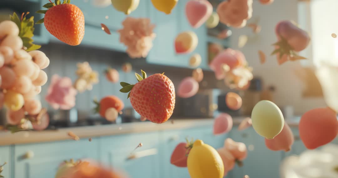 AI Generated Image. In this video, a variety of colorful fruits such as strawberries, lemons, peaches, and grapes are drift leisurely in a well-lit, modern kitchen setting. The dynamic play of colors against the minimalist style exemplifies vibrancy and freshness associated with a health-conscious lifestyle. This could be ideal for promoting food-related products, illustrating culinary creativity, or videory focusing on freshness and vitality.