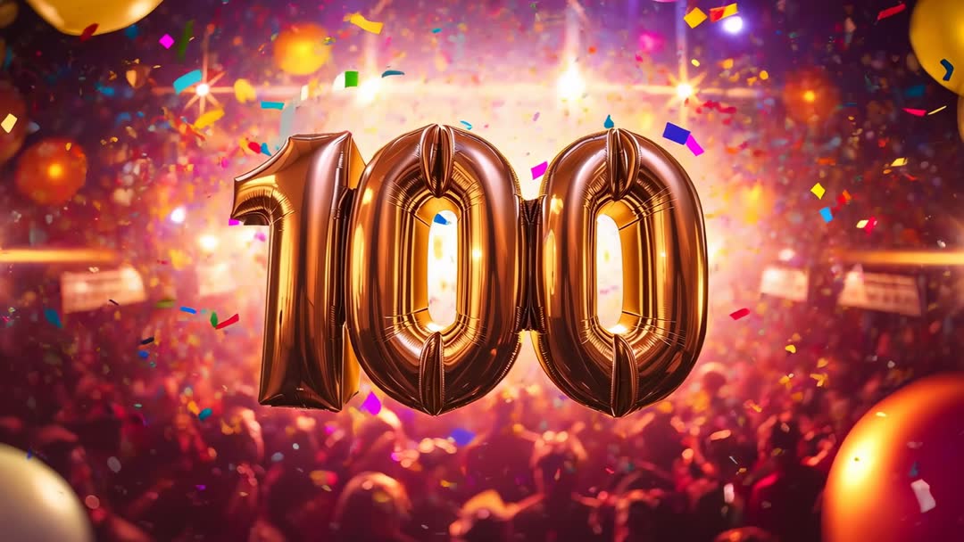 AI Generated Image. Video showing floating gold foil number 100 balloon over lively crowd, confetti falling, stage lights glowing and lens flares sparkling. Camera focusing on shiny metallic balloon while background crowd cheering and colorful confetti drifting through warm party lights. Vibrant color palette and dramatic lighting creating festive, celebratory atmosphere ideal for milestone announcement. Useful for marking corporate anniversaries, product milestone celebrations, social media milestone posts, follower-count reveals and sales achievement campaigns. Suitable as event opener for concerts, galas and club nights, or as banner visual for email marketing, website hero, presentation slides and digital invitations. Editing-friendly composition for overlaying text, logo, countdown or animated titles.