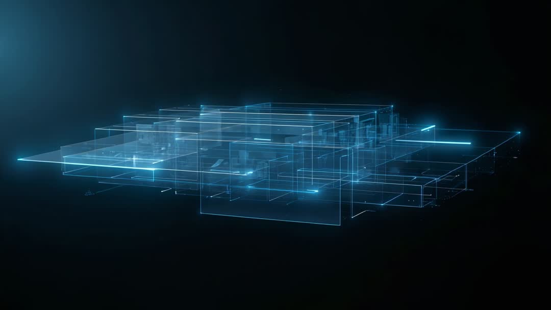 AI Generated Image. Clip showing floating holographic planes building translucent layered blueprint of complex data architecture in neon blue over dark void. Lighting pulsing and neon nodes connecting planes, creating strong sense of depth and digital motion. Ideal for use in tech presentations, product demos, AI concept explainers, cybersecurity reports, website hero headers, broadcast opens, app backgrounds. Editors pairing clip with slow dolly, parallax, subtle grain and light bloom for cinematic atmosphere. Looping and trimming-friendly for seamless background animations and title sequences. Suiting corporate branding, marketing, editorial, UI motion design, and science or innovation storytelling.