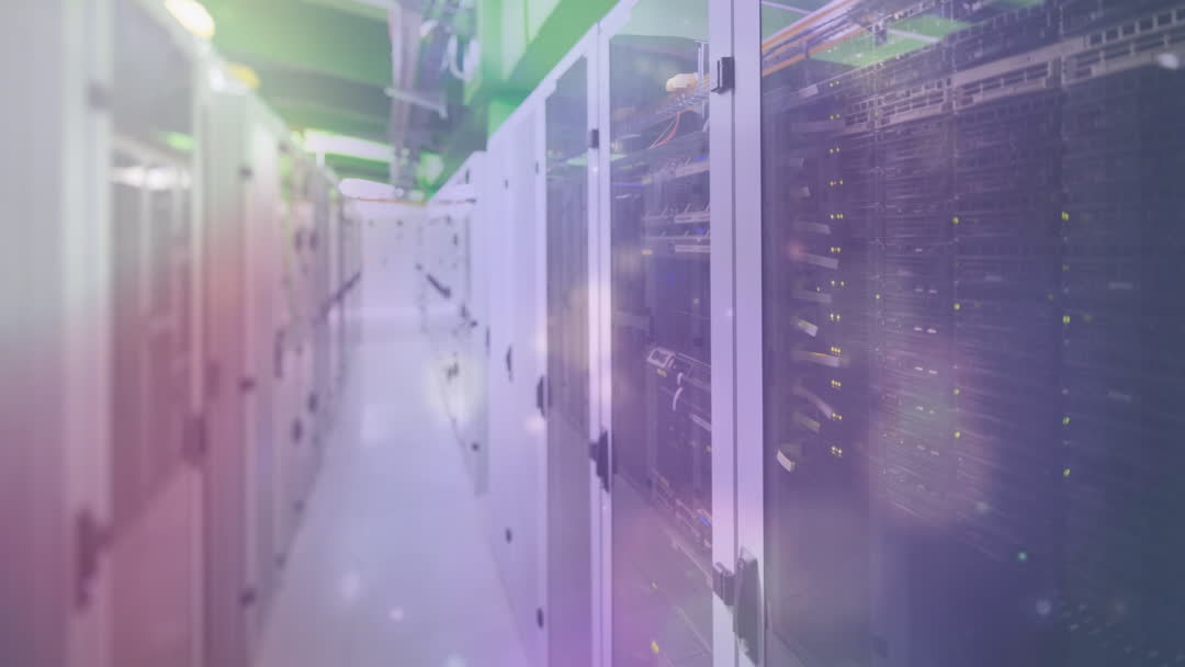 Presented is a digital animation with floating light effects over modern servers in a data center environment. This illustrates concepts of global connections, advanced technology, data processing, and innovation in IT infrastructure. It is useful in presentations or articles focused on computing, data management, and innovative technology industries.