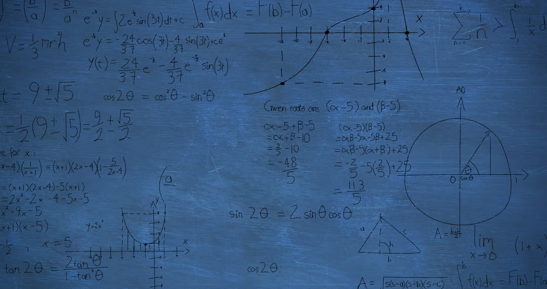 Animated display of mathematical equations and graphs against a textured blue backdrop is ideal for educational themes, STEM concepts, and school-related visual content. Suitable for illustrating learning processes, classroom settings, or as engaging backgrounds for presentations and educational videos.