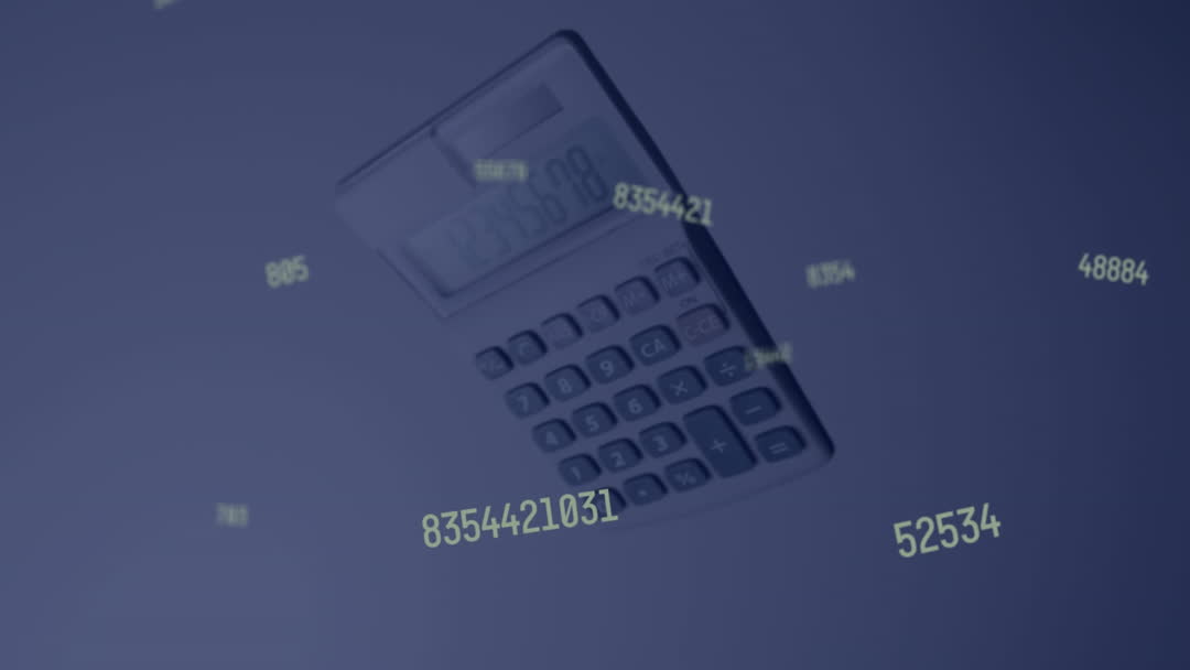 Features an animation with floating numbers over a classic calculator. Symbolizes concepts related to global finance, economy, and accounting technology. Great for use in financial services, educational materials, or technology presentations.