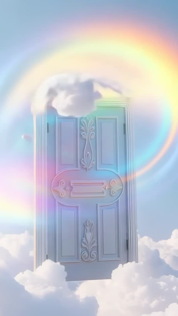 - Floating ornate door hovering above clouds, rainbow aura shifting in dreamy vertical fantasy video
