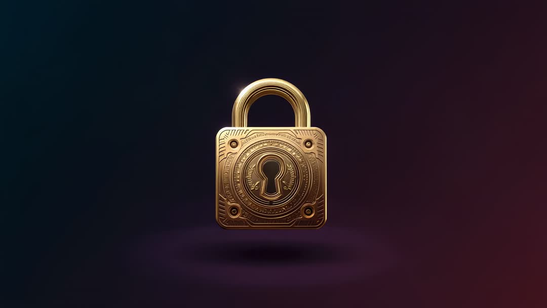 - Floating ornate golden padlock rotating over dark gradient backdrop, cinematic security animation