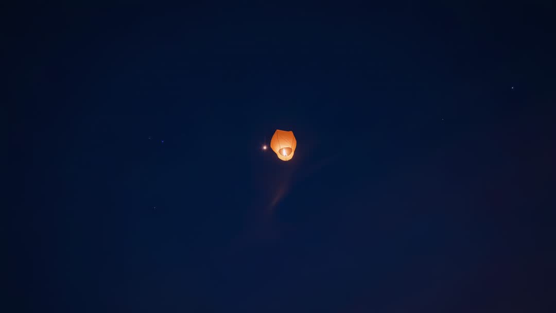 - Floating Paper Lantern Rising through Night Sky with Warm Glow and Faint Smoke Trail