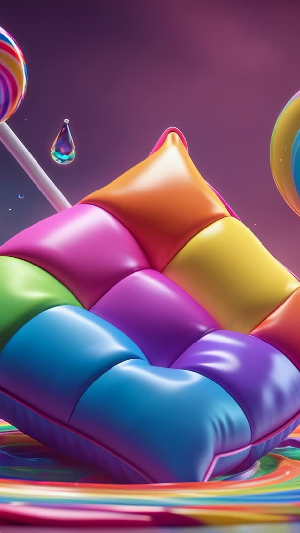 AI Generated Image. Floating glossy rainbow cushion drifting on swirling color pool, composed in vertical aspect for mobile and social platforms. Featuring vivid gradient background, candy lollipop elements, and hovering liquid droplet to create surreal playful mood. Serving use cases such as social media vertical ads, mobile wallpapers, app splash screens, event promos, children's content, packaging mockups, and motion graphics. Providing loop-ready composition for seamless playback and offering high-resolution MP4 and still export options for print and web.