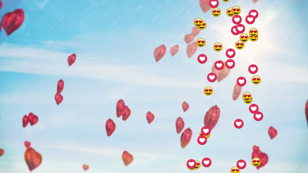 Red balloons are graphically illustrated against a clear blue sky, with an overlay of falling social media icons like hearts and emojis. This visually engaging animation conveys themes of digital communication, love, and community interaction, making it ideal for presentations, social media headers, or marketing materials focused on engagement and virtual interaction.