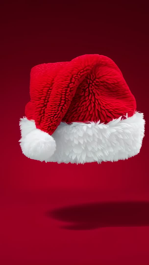AI Generated Video. Clip showing floating red Santa hat rotating and gently bobbing over soft shadow on red gradient background. Close-up revealing plush velvet texture, fluffy white fur trim and pom-pom for tactile festive appeal. Serving as vertical loop for mobile-first campaigns, social media ads and short-form reels. Pairing easily with animated text, logo reveal and promotional copy for holiday sales, countdowns and event teasers. Allowing simple compositing over alternative colors or graphic artwork, or placing product shots beneath hat for playful reveal. Suitable for e-card animations, email headers, in-app banners, storefront digital signage and seasonal website heroes.