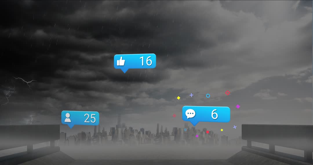 - Floating Social Media Notifications Over Stormy Urban Skyscape