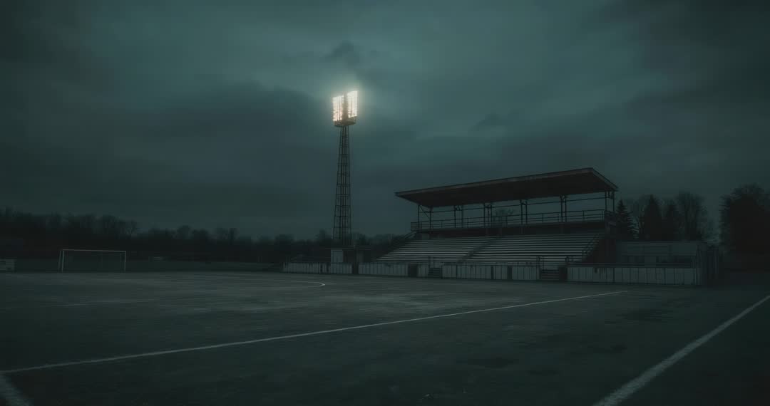 AI Generated Image. A glowing floodlight illuminates a deserted soccer pitch at dusk with empty bleachers in the background, capturing the tranquil and peaceful atmosphere of an abandoned sports venue. Could be used for themes such as serenity in sports spaces, or night settings in sports-related content. An atmosphere of anticipation despite the absence of games or players.