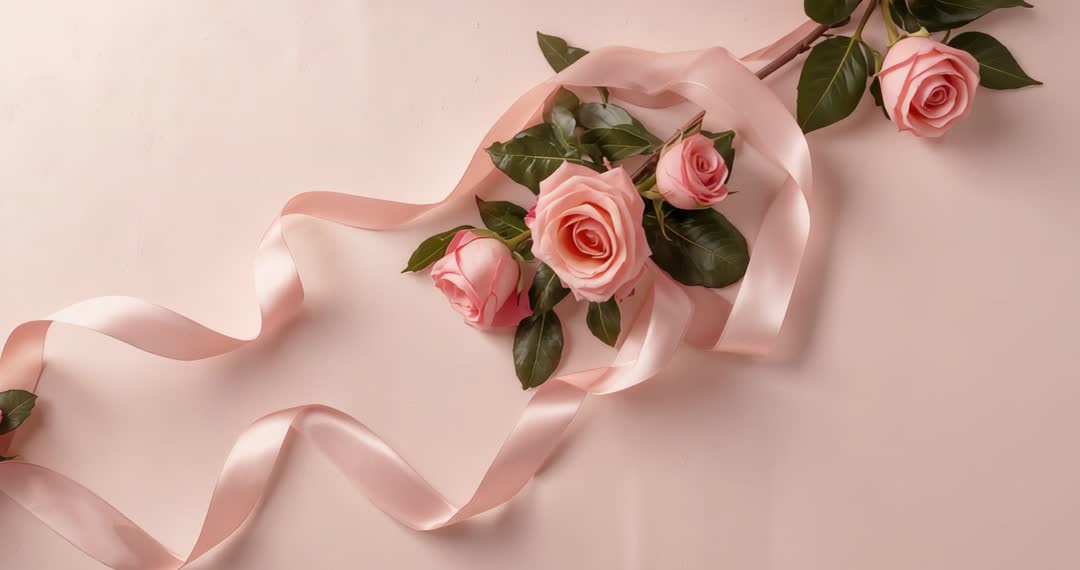 - Floral Elegance with Pink Roses and Ribbon on Blush Linen
