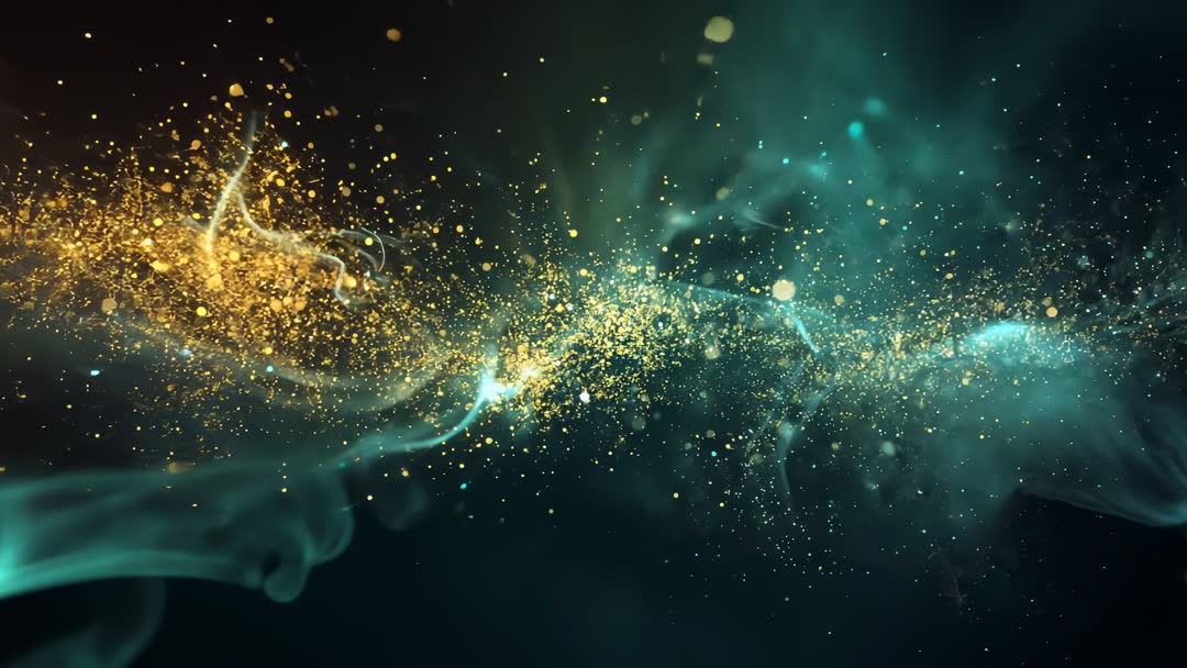 AI Generated Image. Video showing flowing band of gold and teal particles merging into luminous core inside dark void. Particles sparkling and drifting with soft smoke plumes, producing cinematic nebula effect and delicate bokeh highlights. Warm gold and cool teal palette creating strong contrast and depth for dramatic visual impact. High-resolution footage working well for title sequence backgrounds, music video visuals, live event projections, website hero banners, product launch trailers, and social media promos. Loop-friendly composition allowing seamless playback for VJ sets, stage backdrops, and ambient screens. Easy to blend with overlays, particle effects, color grading, and mask reveals for custom branding. Usage ideas: opening sequence loop, logo reveal transition, trailer sting, background for motion graphics, scenic filler between scenes. Delivery tip: extend loop length by overlapping crossfades or time remapping to increase duration while preserving natural flow.