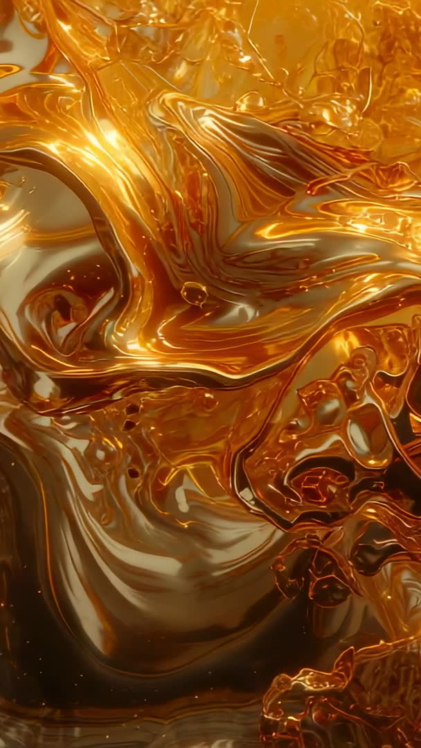 AI Generated Image. Flowing golden resin captured in vertical macro clip, camera moving across molten amber surface. Bubbles migrating and settling, glossy viscous layers creating reflective highlights and swirling patterns. Studio lighting accentuating warm metallic tones and fluid depth. Ideal for use as cinematic background, brand opener, luxury packaging promo, social media story, mobile ad, VJ loop, or texture overlay for motion graphics. Easy looping for seamless playback; apply subtle color grading and overlay text or logo in calm areas. Available in high resolution vertical format for mobile-first projects.