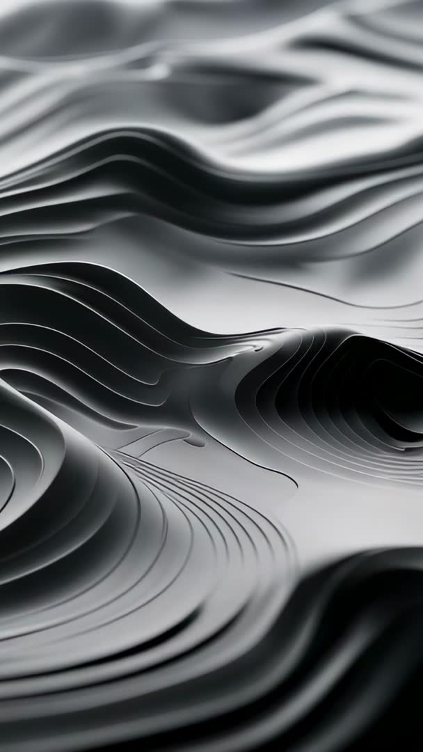 AI Generated Image. Vertical seamless loop showing flowing layered waves forming from smooth CG contour lines and monochrome metallic surfaces. Motion rippling and gliding across frame while layers are morphing and overlapping, creating hypnotic depth and tactile texture. Suiting background use in tech branding, UI animations, title sequences, social media stories, mobile ads, music visuals, art installations. Pairing with overlay text, logo reveal, slow ambient music, or subtle parallax for enhancing depth. Offering color grading options: keeping monochrome for minimalist look or adding gradient maps for vibrant cinematic feel. Loop-ready format fitting vertical screens and mobile-first campaigns.