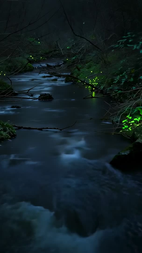 AI Generated Image. Vertical video showing narrow stream flowing through mossy forest ravine at night, illuminated by glowing fireflies and soft green reflections on water. Long exposure creating silky smooth water flow and scattering bioluminescent points among branches and rocks. Mood evoking calm, mystery, and wonder, with cinematic color contrast between deep blues and luminous green highlights. Usage ideas: - Serving as background footage for nature documentaries and environmental shorts - Providing visual loop for meditation and relaxation apps - Enhancing social media stories and vertical ads for outdoor gear or travel brands - Supplying title intro or ambient b-roll for film and video projects - Supporting seasonal campaigns, night scene sequences, or fantasy and magical storytelling Technical notes: - Vertical orientation optimized for mobile and social platforms - Allowing color grading and overlaying text or logos - Pairing well with subtle audio such as flowing water and soft crickets