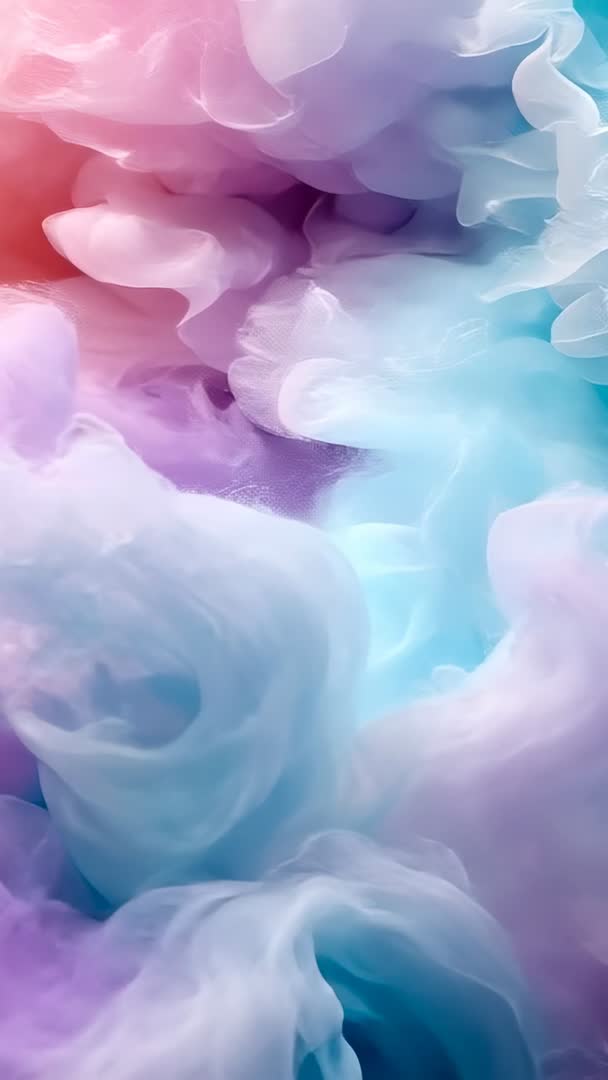 AI Generated Video. Featuring flowing pastel plumes blending inside clear water tank, capturing vertical macro detail with studio lighting. Soft cyan, pink, purple gradients creating dreamy, cloudlike textures and smooth liquid motion. Studio lighting enhancing translucency and diffusion, adding subtle highlights and depth. Ideal for background loops, app intros, social vertical stories, beauty and wellness promos, meditation or relaxation videos, motion graphics overlays, broadcast transitions, website hero loops, and packaging designs. Supplying high-contrast layers for color grading and compositing, enabling creative masking and overlay effects. Trimming to short loops or slowing playback for calming ambience, or speeding for energetic transitions. Providing versatile source for branding, digital ads, and immersive visuals.