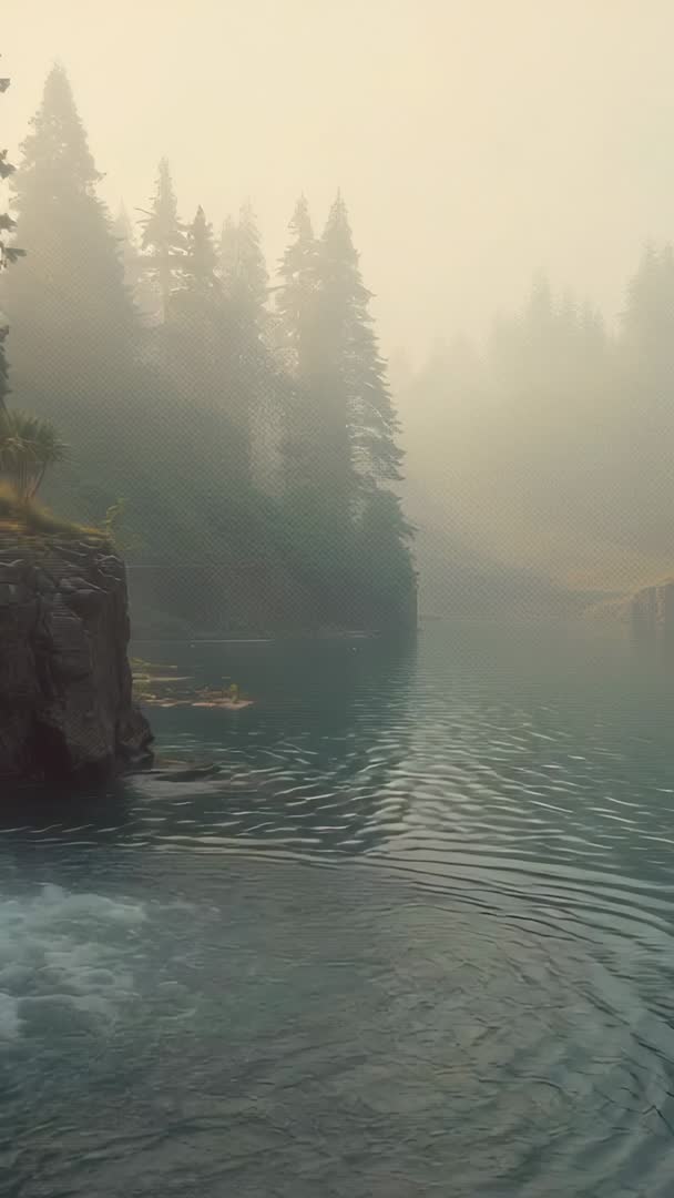 AI Generated Image. Vertical footage showing river channel flowing beside rugged cliff while pine-covered gorge fading into soft morning mist. Foreground ripples spreading outward after pulse near cliff edge, creating subtle wave patterns and delicate reflections on calm water. Tall conifers lining opposite bank and weathered rockface anchoring left frame, offering strong vertical composition and sense of depth. Muted green and blue-gray palette and diffused light conveying peaceful, cinematic atmosphere. Usage ideas: Suited to vertical social media clips and short-form video content; serving as calming background loop for meditation and wellness apps; working as B-roll for travel and adventure promos, nature documentaries, environmental campaigns; fitting phone wallpapers, screensavers, storefront vertical displays, and digital signage. Suggested edits: applying slow-motion or gentle speed ramping to emphasize ripples; color grading toward cool tones for moody look or warm tint for sunrise feel; creating seamless loop for ambient video installations.