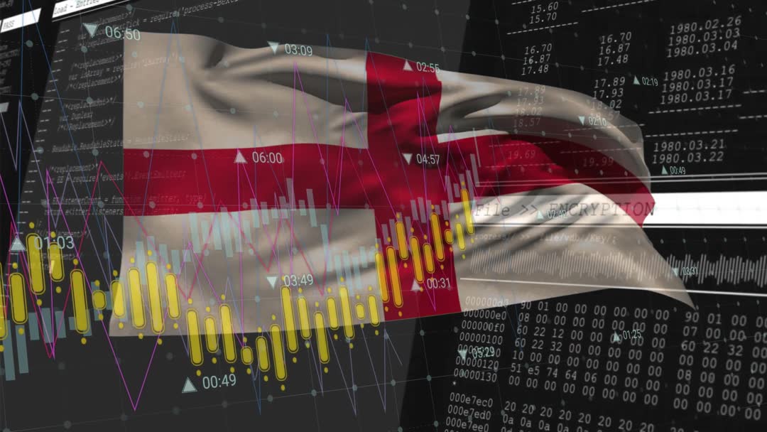 Scene shows England flag with animated candlestick bars overlaid on financial charts, creating an innovative background for discussions or presentations on financial technology or digital marketplaces. Suitable for illustrating complex data analyses and encryption concepts in modern financial settings, blending patriotism with technological progress.
