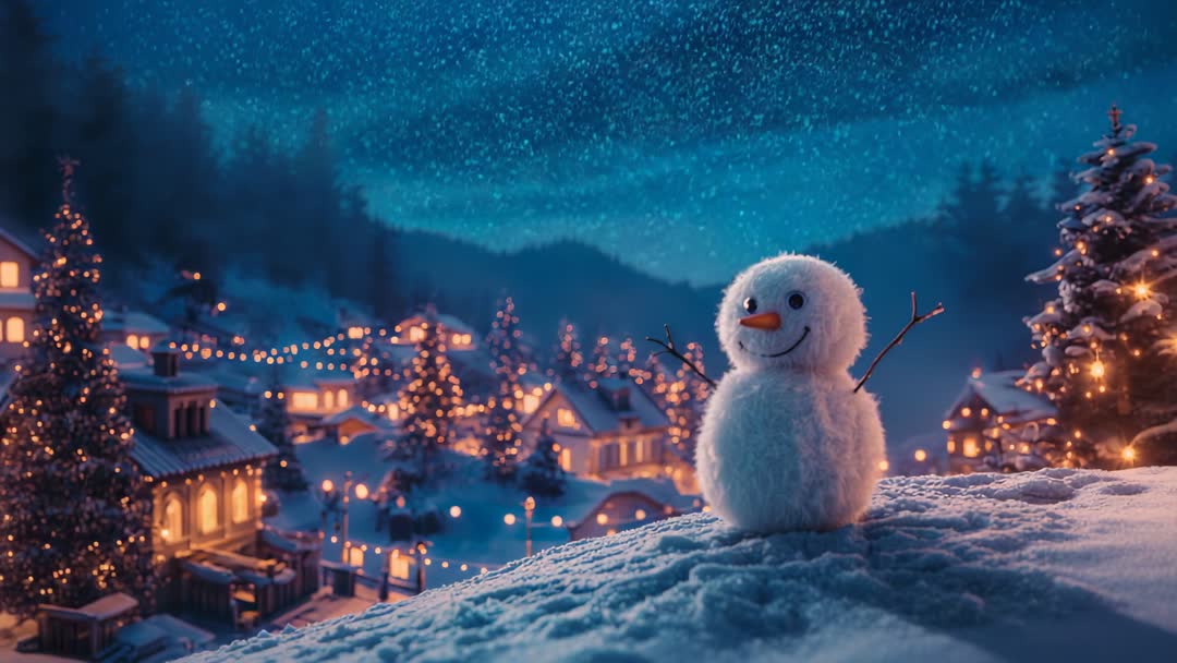 - Fluffy Snowman Overlooks Festive Winter Village at Night