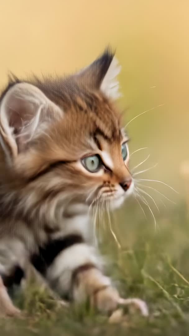 AI Generated Video. Close-up vertical video showing fluffy tabby kitten crouching and prowling through sunlit meadow during golden hour. Soft warm light highlighting fur and whiskers, shallow depth of field isolating subject from blurred grassy background. Kitten displaying focused gaze and careful paw placement, conveying curiosity and playful hunting behavior. Vertical frame optimized for mobile-first platforms and vertical timelines. Use for social media reels, mobile ads, pet brand content, blog headers, greeting cards, children's book illustrations, nature montages, background loops for waiting rooms, veterinary clinic displays, educational videos about kitten care, and animal rescue campaigns. Clip working well as cutaway footage for lifestyle edits, warm brand storytelling, or cute pet compilations.