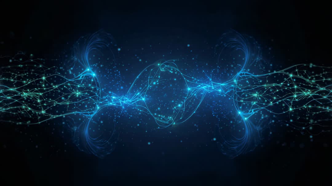 AI Generated Image. Video shows futuristic flow of digital information against dark background, with flowing lines beautifully merging into nodes while particles gently drift across screen. Ideal for illustrating concepts of data networks, technology fusion, cyber environments or visions of the digital future. Great resource for advertising technology services, creating engaging visual presentations, and enhancing multimedia projects focused on innovation.