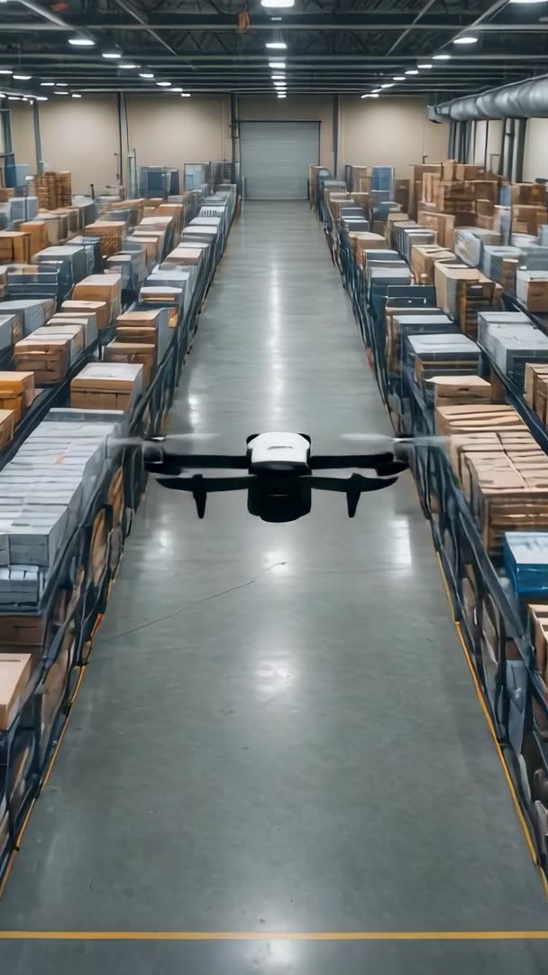 AI Generated Image. Vertical video showing white quadcopter drone flying down wide warehouse aisle between rows of stacked boxes and pallets. Camera following drone at eye level, capturing smooth forward motion and industrial lighting. Scene demonstrating automated inventory inspection, indoor drone navigation and warehouse robotics integration. Footage suiting logistics and supply chain marketing, technology product demos, corporate presentations, e-learning about warehouse automation, social media reels and vertical ad campaigns. Serving as B-roll for warehouse safety training, fulfillment center process videos, inventory audit case studies or hero clip for startup showcasing drone-based inspection services. Neutral industrial tones and strong leading lines creating cinematic motion and space for overlay text, lower-third graphics and logo.