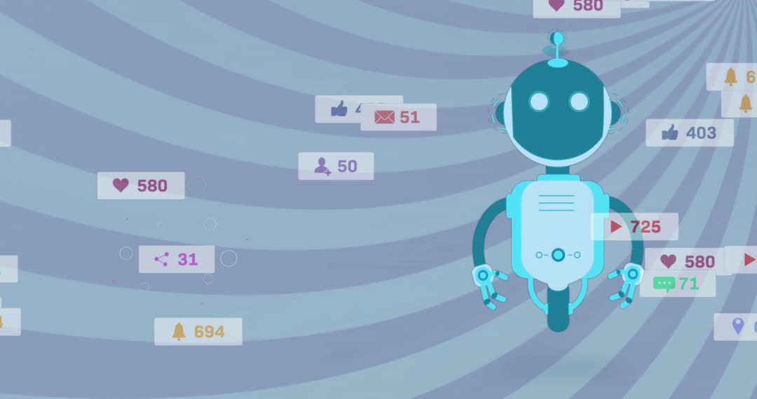 An animation features a whimsical flying robot surrounded by various social media notifications, against a blue striped backdrop. This illustration captures the essence of technology and machine learning, and could be ideal for presentations, blogs, or articles focused on digital trends, social media engagement, or futuristic concepts.
