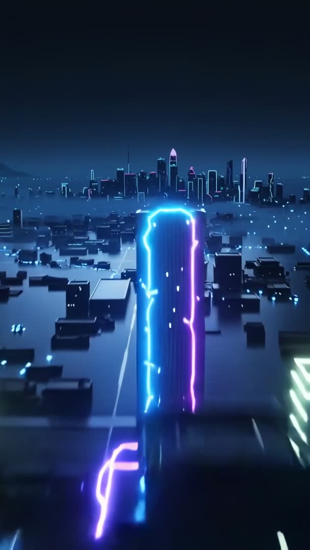 AI Generated Image. Vertical video showing camera flying through neon-lit city while glowing circuitry veins trace along tower facades and distant skyline pulses with magenta and cyan highlights. CGI-style visuals using deep blues and electric pinks to create moody futuristic atmosphere and high-tech vibe. Useful for tech commercials, app intros, social media vertical ads, music video overlays, streaming channel intros, game trailers, and event visuals. Serving as loopable background for title sequences, UI demos, and product presentations while pairing well with synthwave soundtrack, glitch transitions, and fast cuts. Optimized for mobile-first projects and vertical platform formats, providing modern cyberpunk aesthetic for branding and creative campaigns.