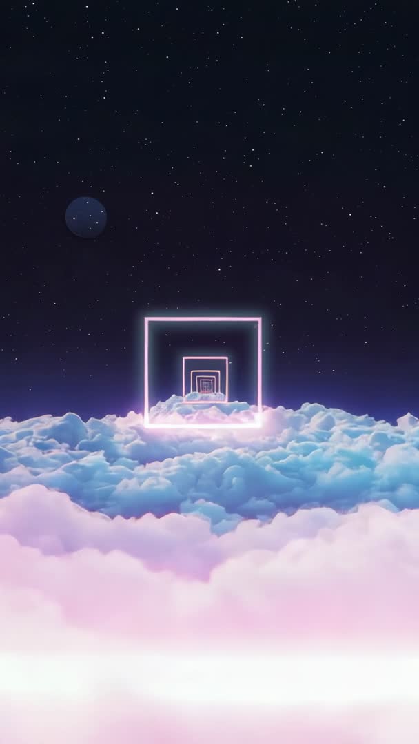 AI Generated Image. Vertical video showing camera flying through repeating glowing neon square frames hovering above soft pastel clouds under starry night sky. Neon frames creating tunnel effect with deep repeating perspective while pastel cloud layer providing dreamy contrast and subtle drift. Perfect for vertical social media stories, short-form intros, music visualizers, meditation loops, and tech product promos. Suggestions for use including looping playback, placing title or logo in upper third, applying subtle vignette and color grade to enhance neon glow, and pairing with ambient synth or chill electronic soundtrack. Delivery details: 9:16 vertical format, looping-friendly, suitable for mobile backgrounds, app splash screens, event visuals, and ad campaigns seeking retrofuturistic or vaporwave mood.