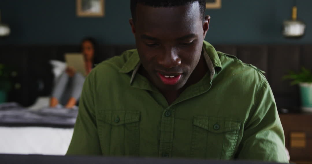 Young African American man concentrates on laptop in cozy home environment, with partner relaxing in the background. The video illustrates a modern work-from-home scenario, showcasing productivity and inclusivity. Ideal for promoting flexible work lifestyles, home office solutions, or communication technology tools.