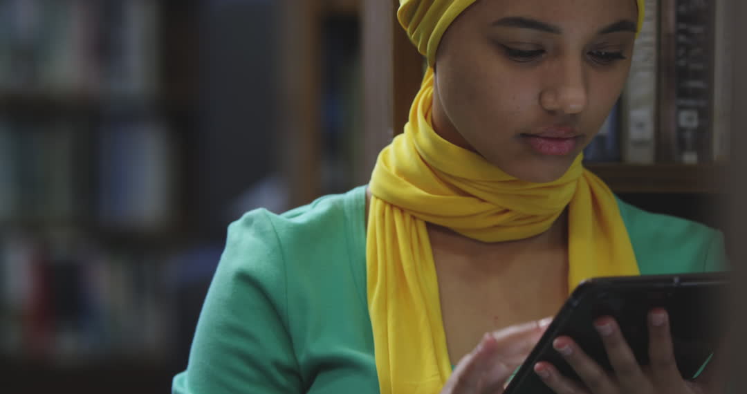 Young woman wearing a yellow hijab engaged in study using a tablet, surrounded by bookshelves. Represents themes of education, multicultural learning, and technology use in modern study environments. Can be used for promoting libraries, digital education platforms, and multicultural academic inclusivity.