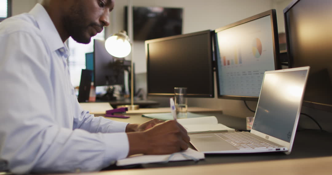 An African American businessman collaborates between screens and laptop, taking notes as he manages data and tasks at a modern office. This is ideal for illustrating concepts of business professionalism, work in financial sectors, or multi-tasking in digital environments. Great for use in articles about productivity, technology in workplace, or office dynamics.
