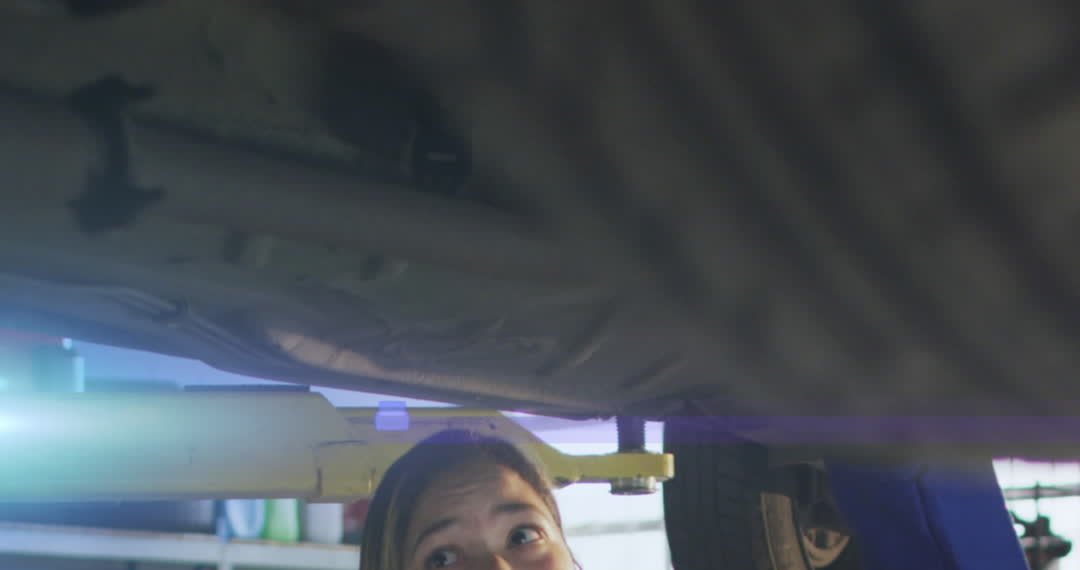 A skilled female mechanic inspects a vehicle undercarriage, highlighting attention to detail and expertise in a car workshop. The scene emphasizes dedication and precision in automotive maintenance. Useful for illustrating themes of women in traditionally male-dominated jobs, professionalism in auto repair, and the intersection of modern technology in mechanical work.